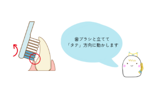 歯磨きするときは、歯と歯ぐきの境目に歯ブラシのつま先を当てて、タテに動かすとプラークが取れやすいので、ぜひ意識して行ってみてください♪